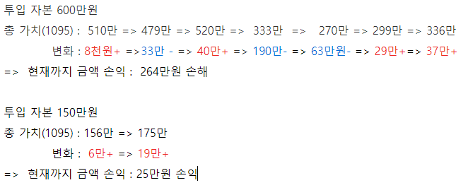 결과를 보면 알다시피 750만원을 투자해서, 일별이자 0.1%를 받았음에도 불구하고, 이자로 약 100만원 상당에 KSP를 받았음에도 불구하고 손해다.