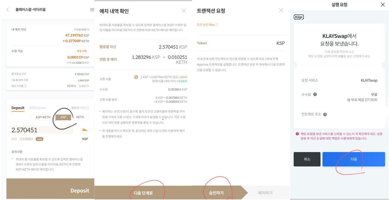 그리고 KSP 절반과 KETH를 예치(Deposit)할 때 한 번(그림은 생략함)