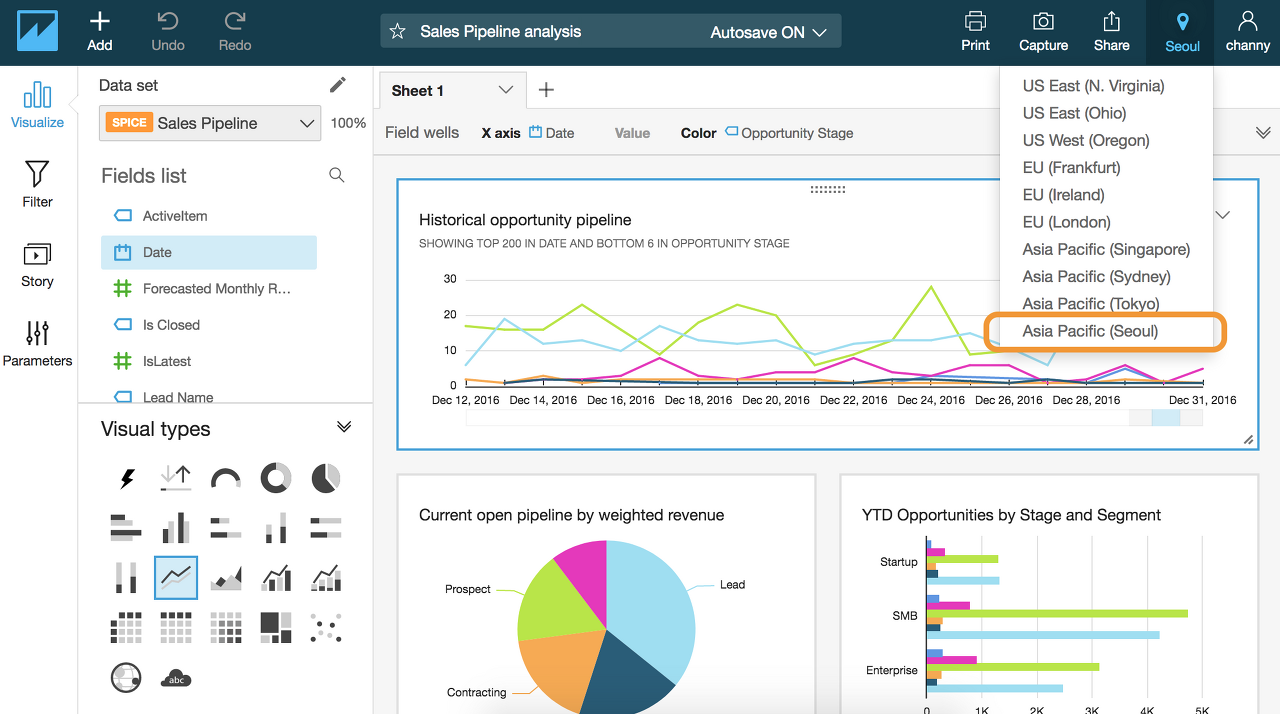 이렇게 분석이 된 자료를 QuickSight를 통해서 시각화 할 수 있다.(Redshift는 그 자체로도 간단한 그래프 등은 보여주는것같다. Redshift Severless (Preview))